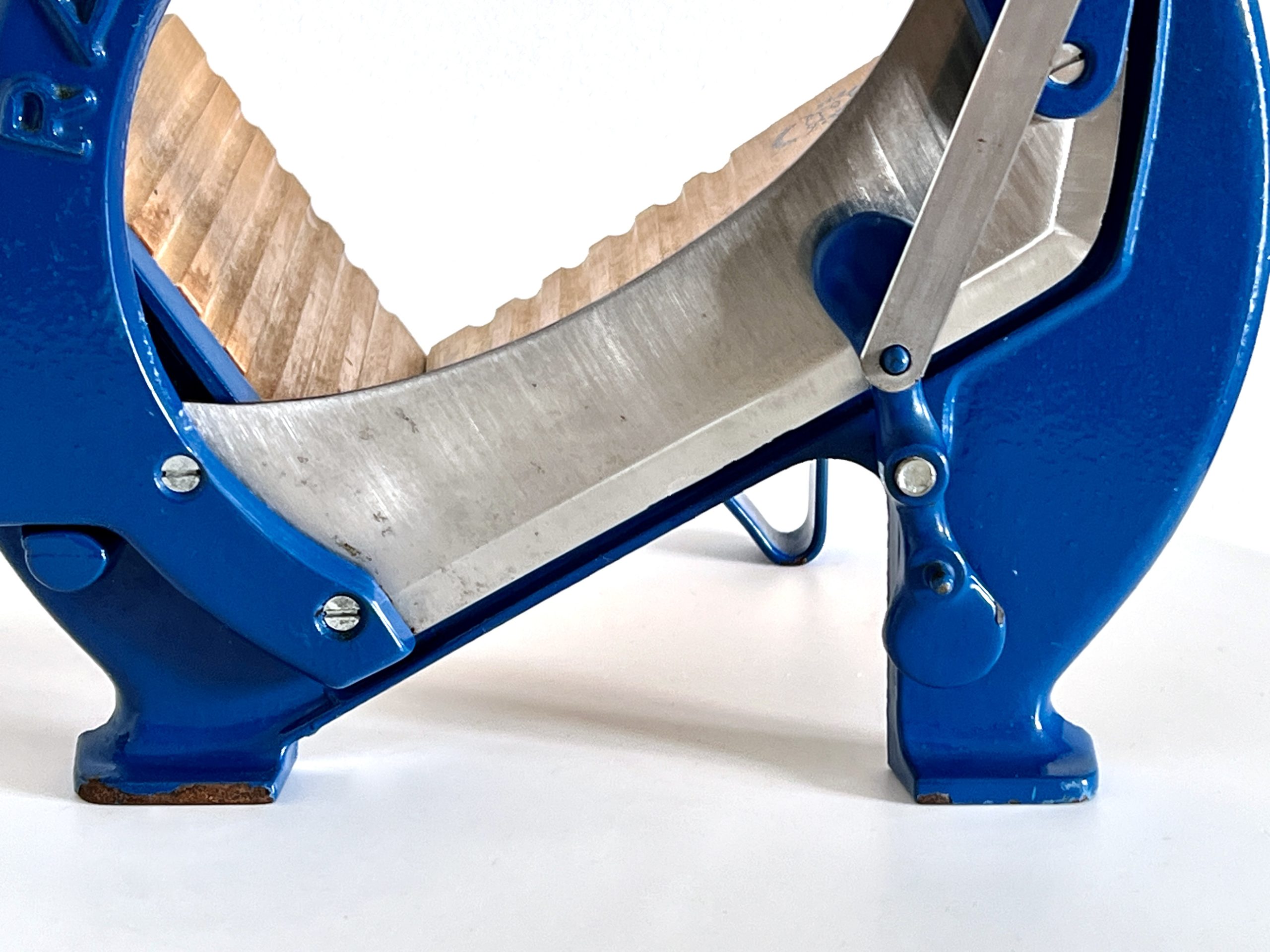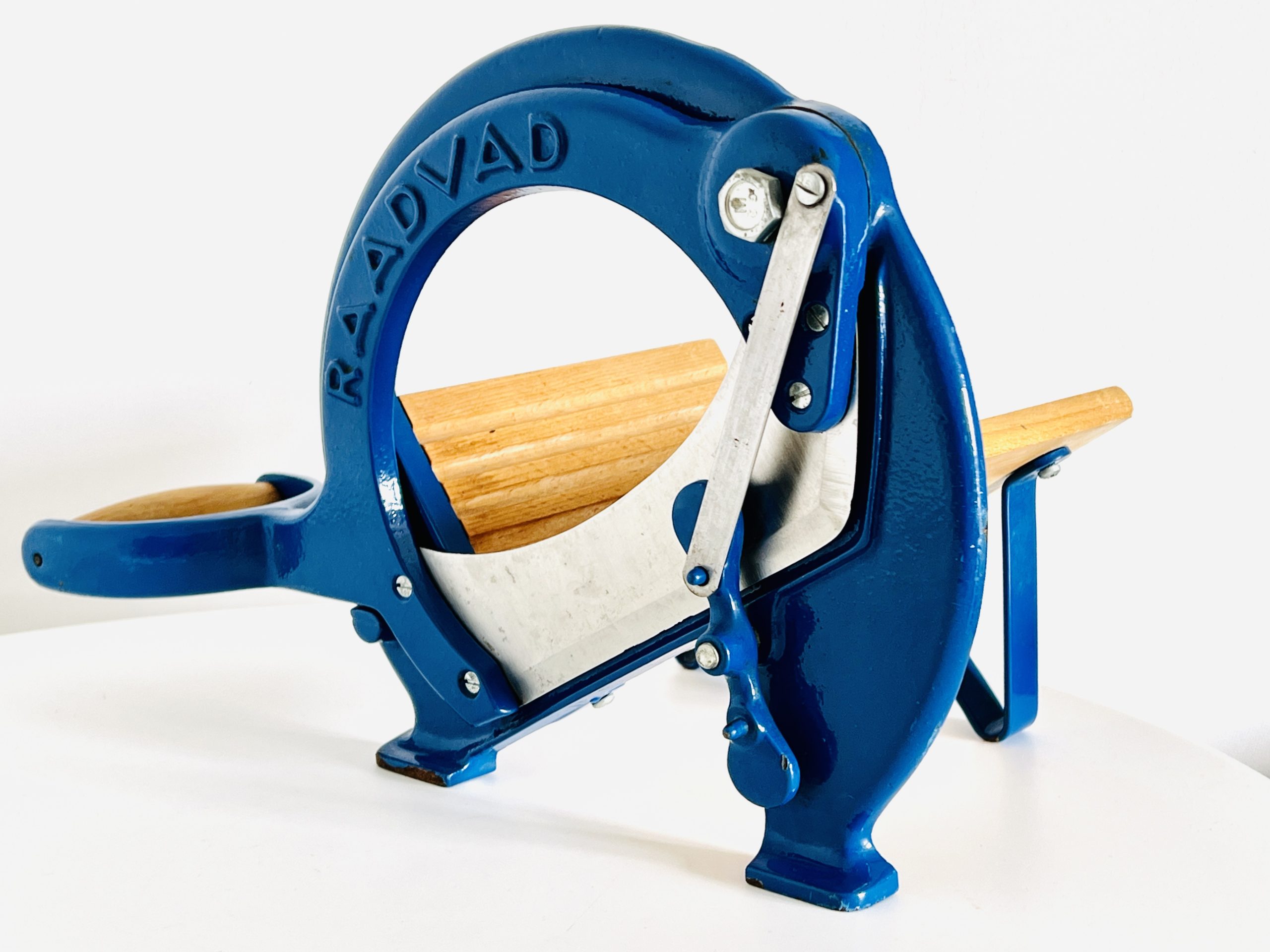 This Raadvad bread slicer in the color blue is made of cast iron and has a sharp stainless steel blade, wooden handle and boards. The Raadvad is also marked in the cast iron and it has the official brand stamps in the wood.